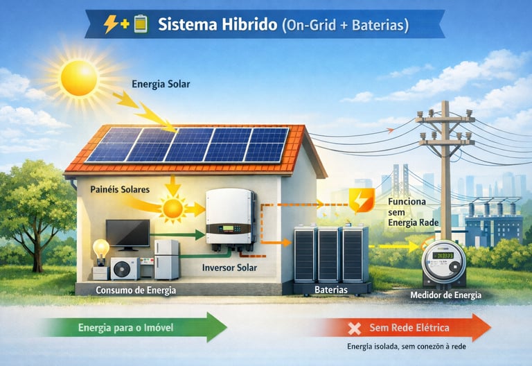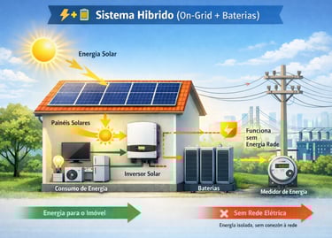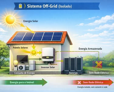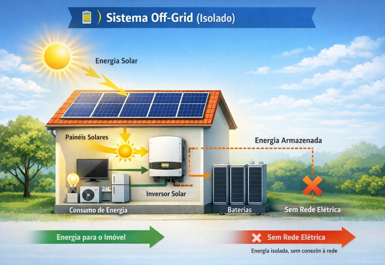O sistema off-grid funciona de forma totalmente independente da rede elétrica, utilizando baterias para armazenar a energia gerada pelos painéis solares.