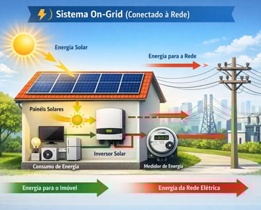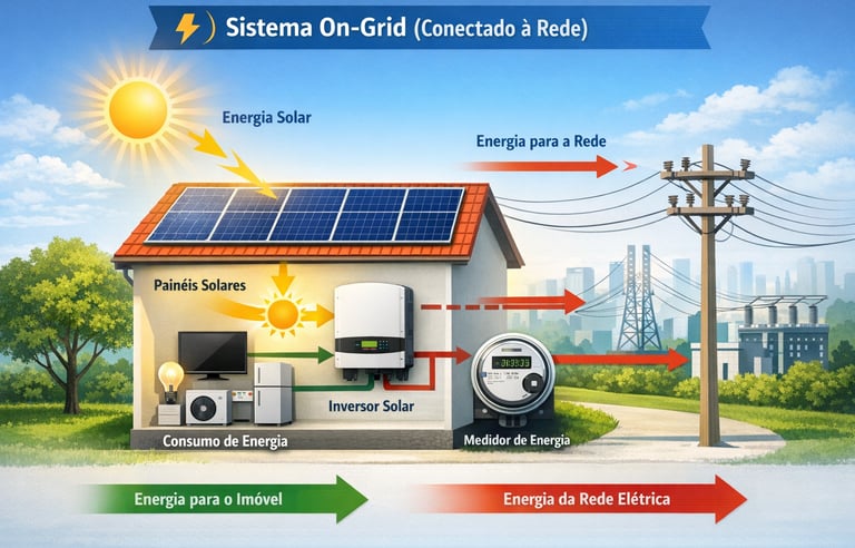 O sistema on-grid é conectado à rede da concessionária. A energia gerada durante o dia é utilizada no imóvel e o excedente vira créditos, que compensam o consumo noturno ou em outros meses.